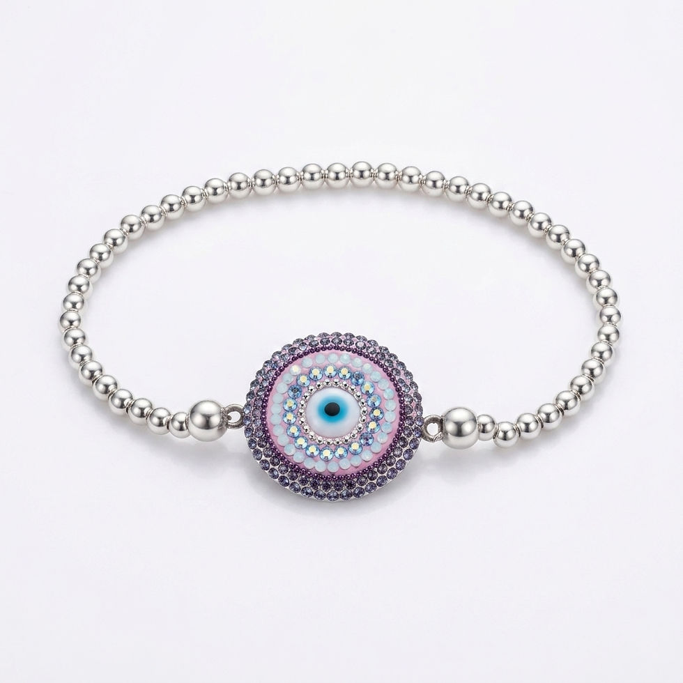 Pulsera de plata .925 con finas cuentas esféricas y un llamativo dije de ojo turco, decorado con delicadas incrustaciones de zirconias que aportan un brillo sutil y elegante. Predominan los tonos rosados en distintas intensidades, creando un efecto femenino y sofisticado con matices únicos. Cuenta con un largo de 18 cm y elástico súper seguro que brinda comodidad y ajuste perfecto. El ojo turco es símbolo de protección, ideal para atraer buena energía mientras elevas tu estilo con un toque especial.